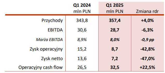 SNK (SANOK) pomimo trudnego otoczenia rynkowego zwiększyła w I kw. 2025 r. przychody ze sprzedaży o 4% rdr, do 357,4 mln zł. Pozytywna kontrybucja konsolidowanej od II kw. 2024 r. fińskiej Grupy Teknikum nie wystarczyła jednak, aby utrzymać skonsolidowane wyniki sprzed roku. Rezultat EBITDA zmniejszył się o 6% rdr, do 28,7 mln zł, a zysk netto zniżył się o 47% rdr, do 7,2 mln zł.