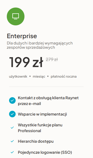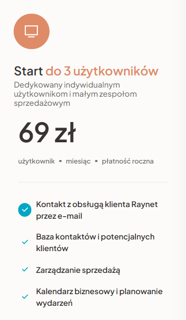 Przykładowy cennik jednego z popularnych CRM – Raynet CRM. Źródło: www.raynetcrm.pl/cennik/