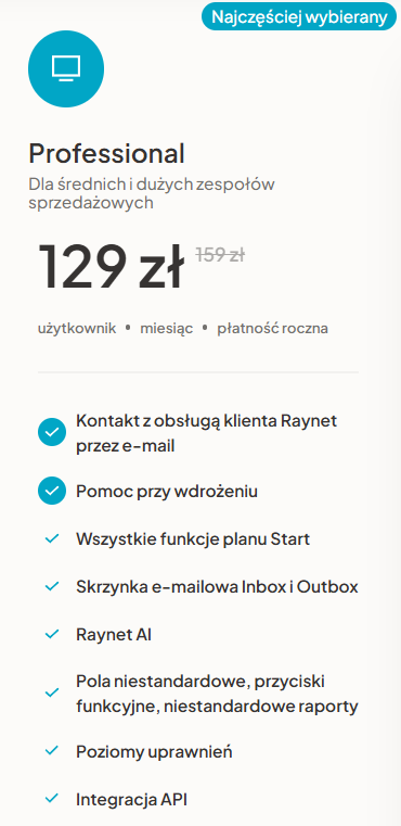 Kolejny poziom kosztowy wynosi średnio 129 zł netto miesięcznie. Taki plan odpowiada potrzebom rozwijających się działów handlowych i zespołów marketingu, które pracują na wielu kanałach komunikacji.