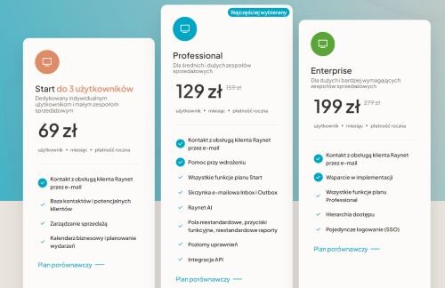 Plan podstawowy Raynet CRM – dostępny za około 69 zł netto miesięcznie za użytkownika – pozwala zarządzać bazą kontaktów, prowadzić kalendarz działań oraz planować rozmowy i spotkania. To wystarczające rozwiązanie dla mikroprzedsiębiorstw, które chcą przejść z zeszytu i arkusza kalkulacyjnego na bardziej uporządkowaną pracę.