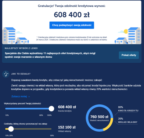 Zdolność kredytową możesz wstępnie oszacować – zanim złożysz jakikolwiek wniosek – wykorzystując dedykowany kalkulator zdolności kredytowej od firmy Lendi. To symulacja pozwalająca ocenić możliwą do uzyskania kwotę kredytu przy konkretnych parametrach dochodowych.