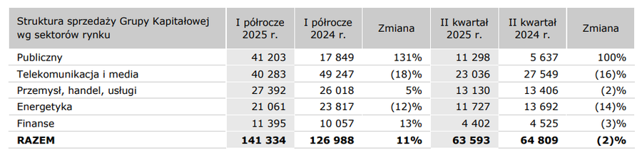Największą sprzedaż w I półroczu 2025 r. oraz największy wzrost zrealizowano w sektorze publicznym. Przychody od klientów sektora wyniosły 41,2 mln zł, co oznacza wzrost o 131% w stosunku do analogicznego okresu roku poprzedniego. Udział sektora w skonsolidowanych przychodach wzrósł z 14% w I półroczu 2024 r. do 29% w raportowanym okresie. Najwięcej projektów zrealizowano dla służb mundurowych i dla jednostek administracji państwowej.
