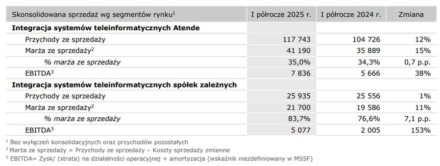W I półroczu 2025 r. w segmencie integracji systemów teleinformatycznych Atende, Spółka osiągnęła przychody ze sprzedaży na wyższym poziomie w stosunku do analogicznego okresu roku poprzedniego (wzrost o 12%). Również marża ze sprzedaży wzrosła wobec ubiegłorocznego poziomu (o 15% r/r). To spowodowało, że zysk EBITDA segmentu w I półroczu br. był wyższy niż rok wcześniej (wzrost o 38%, do 7,8 mln zł).