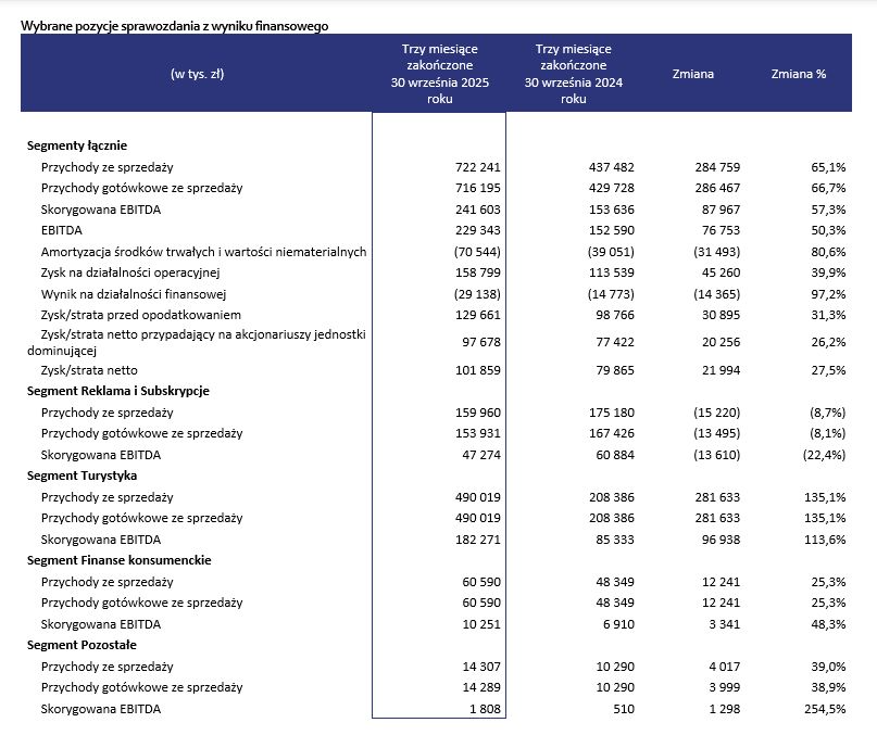 W trzecim kwartale 2025 roku Wirtualna Polska Holding S.A. osiągnęła 716,1 mln złotych przychodów gotówkowych ze sprzedaży, co oznacza wzrost o prawie 67% w porównaniu do analogicznego okresu ubiegłego roku. Skorygowana EBITDA WPL (WIRTUALNA) wyniosła 241,6 mln złotych, rosnąc o 57% rok do roku. Głównym motorem tego dynamicznego wzrostu pozostaje segment turystyki, wzmocniony niedawnymi akwizycjami w tym obszarze.
