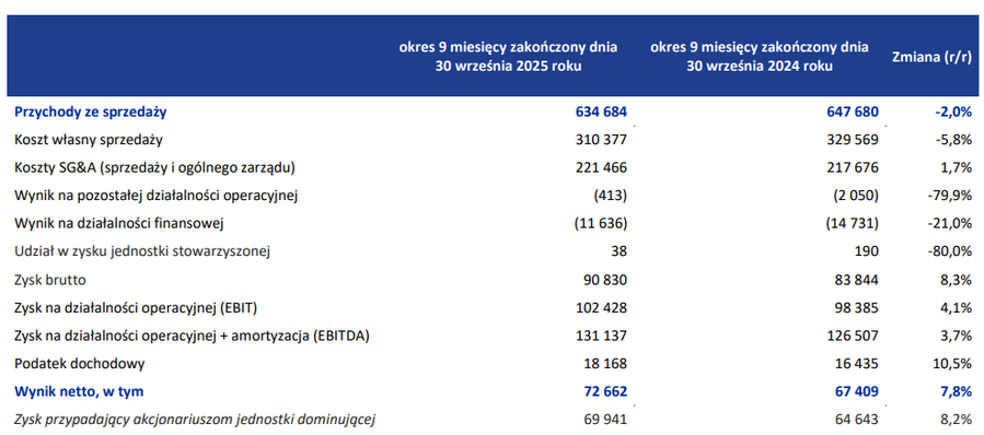 Na koniec września 2025 r. wskaźnik dług netto/EBITDA Grupy wyniósł 1,14 w porównaniu z 1,6 rok wcześniej.