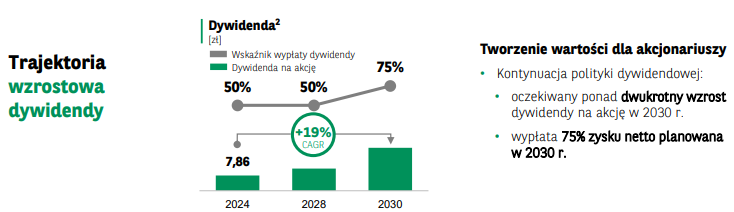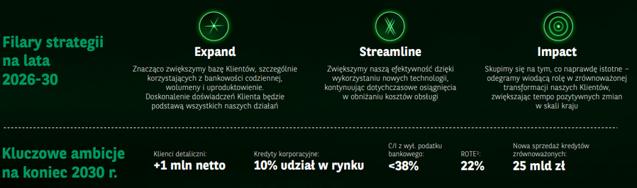 Bank zakłada utrzymanie współczynnika Tier 1 na poziomie 2 punkty procentowe powyżej wymogu regulacyjnego w horyzoncie strategii. Rentowność kapitału (ROTE) ma osiągnąć 22% w 2030 r. Wypłata dywidendy z zysku netto za 2030 r. ma wynieść 75% wobec 50% obecnie.