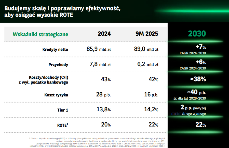 Cele finansowe strategii obejmują wzrost portfela kredytowego o 7% CAGR w latach 2024-2030. Przychody mają rosnąć o 6% CAGR w tym samym okresie, przy wzroście kosztów o 4% CAGR. Wskaźnik kosztów do dochodów ma spaść poniżej 38% w 2030 r., a koszt ryzyka utrzymać się na poziomie około 40 punktów bazowych średnio w latach 2026-2030.