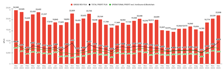 Przychody pomniejszone o koszty UA i prowizje platform za grudzień wyniosły 9,81 mln PLN - najwięcej w historii, co oznacza wzrost o 27,5% w ujęciu miesięcznym i 34,6% r/r, odzwierciedlając ciągłą poprawę rentowności bazowej i dyscyplinę kosztową.