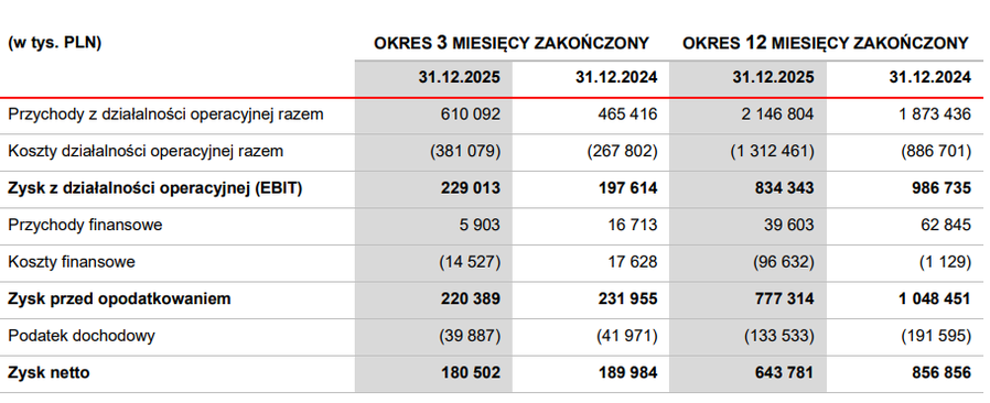 "W samym IV kwartale 2025 r., który pod kątem charakterystyki rynkowej stał pod znakiem instrumentów towarowych oraz indeksów amerykańskich, ze szczególnym uwzględnieniem metali szlachetnych, przychody Grupy kształtowały się na istotnie wyższym poziomie i wyniosły 610,1 mln PLN (III kwartał 2025 r.: 375,8 mln PLN). Na poziom ten wpływ miały: (i) wyższa rentowność jednostkowa lota wynosząca 208 PLN (wzrost o 56 PLN k/k); (ii) wyższy obrót klientów instrumentami finansowymi wyrażony liczbą zawartych transakcji w lotach – wzrost o 448,2 tys. lotów do poziomu 2 542,5 tys. lotów (w porównaniu z 2 094,3 tys. w III kw. 2025 r.)" - podano w komunikacie