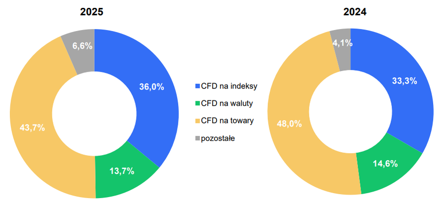 XTB podało, że w 2025 r. największy udział w przychodach (43,7%) miały instrumenty CFD oparte na towarach, w szczególności na notowaniach złota, gazu ziemnego oraz kakao. Drugą najbardziej dochodową klasą aktywów były CFD na indeksy, głównie amerykańskie US100 i US500 oraz niemiecki DAX, których udział w strukturze przychodów wyniósł 36,0% (wobec 33,3% rok wcześniej). CFD na waluty odpowiadały za 13,7% przychodów (wobec 14,6% rok wcześniej).