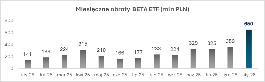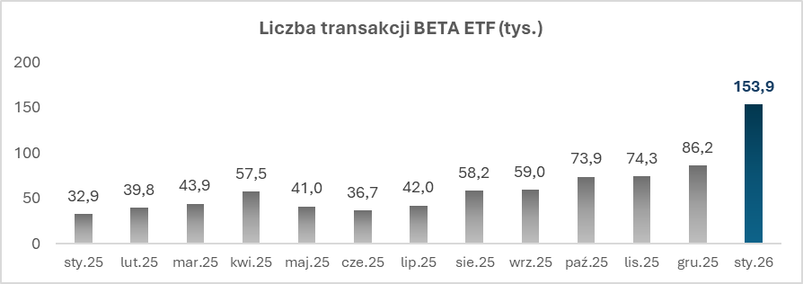 Styczeń 2026 roku przyniósł rekordową aktywność inwestorów w funduszach BETA ETF. Napływy netto do funduszy wyniosły 314 mln zł, co oznacza wzrost o ponad 851% w porównaniu ze styczniem 2025 roku. Obroty na instrumentach BETA ETF przekroczyły 650 mln zł, rosnąc o 361% r/r, a liczba transakcji osiągnęła około 154 tys., wobec 33 tys. rok wcześniej.