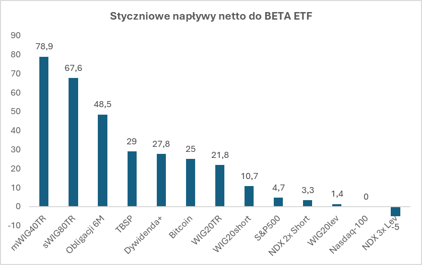 Istotnym elementem styczniowych wyników była także struktura napływów. Z około 314 mln zł nowych środków aż 196 mln zł zostało zainwestowane w ETF-y oparte o klasyczne polskie indeksy akcji.