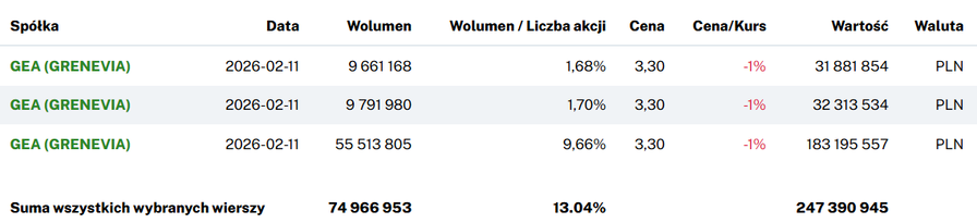 Zarząd GEA (GRENEVIA) przekazał do publicznej wiadomości informacje o transakcjach dotyczących akcji spółki. W dniu 16 lutego 2026 r. spółka otrzymała powiadomienie od TDJ Equity I sp. z o.o. Zawiadamiający jest osobą blisko związaną z osobami pełniącymi obowiązki zarządcze w Grenevia, tj. z Michałem Ciszkiem, członkiem Rady Nadzorczej, Robertem Rogowskim, członkiem Rady Nadzorczej oraz Tomaszem Domogałą, przewodniczącym Rady Nadzorczej sprawującym kontrolę nad TDJ Equity I. Powiadomienie dotyczyło transakcji ustanowienia zastawu na akcjach spółki.