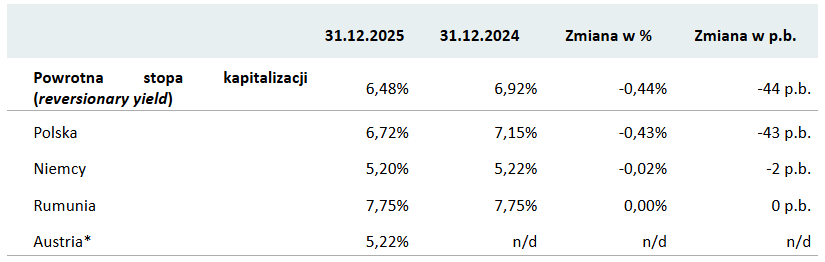 W 2025 roku stopy kapitalizacji dla portfela nieznacznie się obniżyły, choć skala tej zmiany nie odzwierciedlała w pełni istotnego spadku stóp procentowych ustalanych przez banki centralne. Rekordowy wolumen zawartych umów najmu przełożył się na bardzo dobre wyniki operacyjne - wartość aktywów netto zwiększyła się o 18% rok do roku, a przychody i EBITDA wzrosły o 15%.