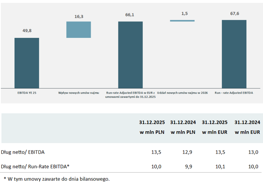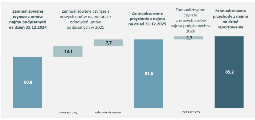 Całkowita wartość zannualizowanych przychodów z czynszów wzrosła z 60,8 mln EUR na dzień 31 grudnia 2024 roku do 85,2 mln EUR na dzień raportowania. Kwota ta obejmuje czynsze z nowych umów najmu (13,1 mln EUR), odnowień umów podpisanych w 2025 roku (7,7 mln EUR) oraz nowych umów podpisanych w 2026 roku (3,7 mln EUR).