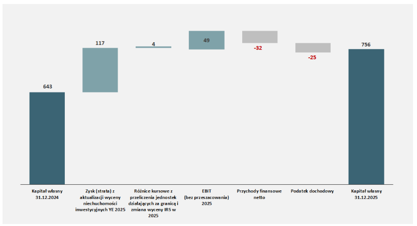 Umocnienie się złotego względem euro miało negatywny wpływ na wycenę naszych nieruchomości inwestycyjnych. W wyniku aprecjacji polskiej waluty w okresie sprawozdawczym (na dzień 31 grudnia 2024 roku: 1 EUR = 4,2730 PLN, na dzień bilansowy 31 grudnia 2025 roku: 1 EUR = 4,2267 PLN; spadek wartości euro o 0,0463 PLN, czyli o 1%), wartość naszych nieruchomości inwestycyjnych obniżyła się o 41,9 mln PLN.