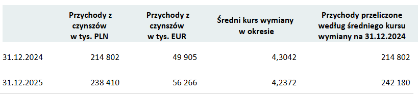 Po przeliczeniu według stałego kursu wymiany (średni kurs z 2024 roku) przychody z czynszów za 2025 rok wynoszą 242 180 PLN.