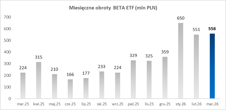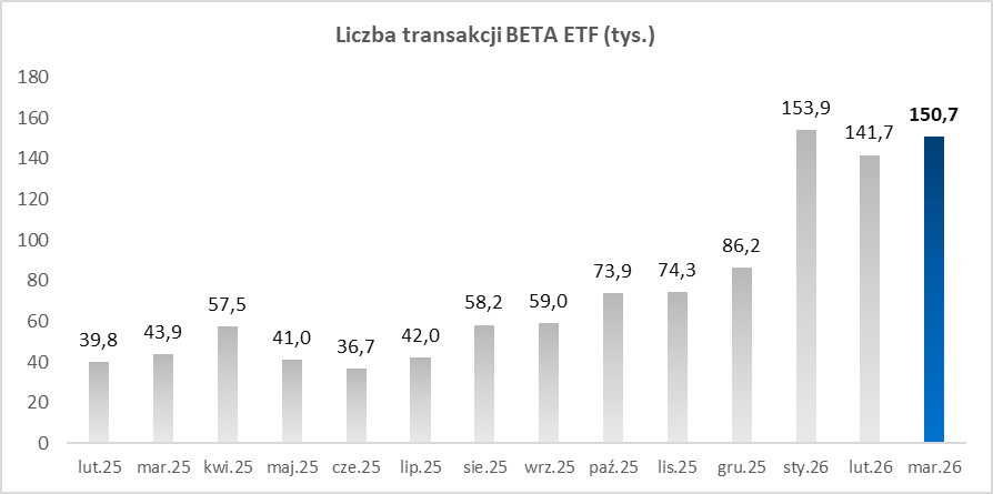 Marzec 2026 roku był kolejnym miesiącem bardzo wysokiej aktywności inwestorów na funduszach BETA ETF. Obroty na funduszach osiągnęły drugi najwyższy miesięczny poziom w historii, podobnie jak liczba zawartych transakcji. Napływy netto były wyraźnie niższe niż w rekordowym styczniu i lutym, jednak w ujęciu rok do roku pozostają bardzo wysokie – były o ponad 147% wyższe niż w marcu 2025 roku