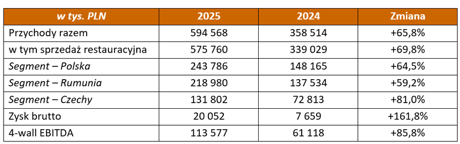 Grupa odnotowała także dynamiczny wzrost wyniku EBITDA na poziomie restauracji (4-wall EBITDA) z 61,1 mln zł w 2024 roku do 113,6 mln zł w roku 2025.