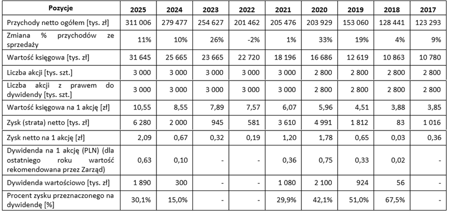 Zarząd Firmy rekomenduje przeznaczanie w tym roku 1 890 tys. PLN zysku netto na dywidendę. Kwota 1 890 tys. zł rekomendowana na dywidendę stanowi 30,1 % zysku netto za 2025 r.; natomiast pozostałe 4 390 tys. zł rekomendowane na zwiększenia kapitału zapasowego stanowi 69,9 % zysku netto. Ze względu na konieczność zgromadzenia środków finansowych na dokończenie rozpoczętej inwestycji w nowoczesne zakłady konfekcjonowania Zarząd rekomenduje wypłatę dywidendy na poziomie dolnych widełek, tj. 30,1 % zysku netto.