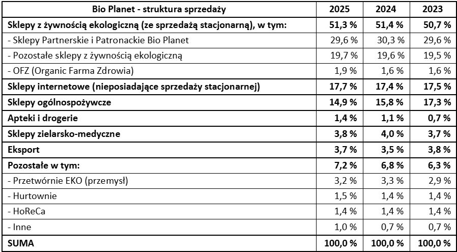 W 2025 r. głównym kanałem sprzedaży Spółki pozostały specjalistyczne sklepy stacjonarne (51,3 % sprzedaży). Udział sklepów internetowych w strukturze sprzedaży Spółki w przedstawiony w tabeli (17,7% w 2025 r.) dotyczy sklepów, które nie prowadzą żadnej innej działalności niż sprzedaż internetowa.