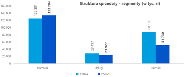 Segment miernikowy, będący kluczowym obszarem działalności Grupy, zwiększył swój udział w strukturze przychodów z 52% do 64%, osiągając poziom około 134 mln zł, co oznacza wzrost o 7% rok do roku. Segment usług montażowych odnotował spadek przychodów do około 24 mln zł, tj. o 16% rok do roku, przy stabilnym udziale w strukturze sprzedaży. Największy wpływ na spadek przychodów Grupy miał segment licznikowy, którego sprzedaż zmniejszyła się do około 52 mln zł, tj. o 41% rok do roku, co było bezpośrednio związane ze zmianą sposobu konsolidacji spółki Foxytech.