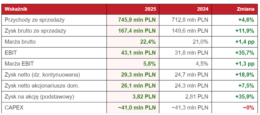 Skonsolidowane przychody ze sprzedaży Grupy wyniosły w 2025 roku 745,9 mln PLN, wobec 712,8 mln PLN rok wcześniej – wzrost o 4,6% r/r. Ważniejsza od dynamiki przychodów jest jakość wyników: zysk brutto ze sprzedaży wzrósł o 11,9% do 167,4 mln PLN, a marża brutto poprawiła się z 21,0% do 22,4%. Zysk operacyjny EBIT wyniósł 43,1 mln PLN – o 35,7% więcej niż w 2024 roku (31,8 mln PLN) – przy marży EBIT wynoszącej 5,8% wobec 4,5% rok wcześniej. Zysk netto z działalności kontynuowanej wyniósł 29,3 mln PLN (wzrost o 18,9%), a zysk netto przypisany akcjonariuszom jednostki dominującej – 26,1 mln PLN. Wynik obciążony jest jednorazową stratą 2,6 mln PLN związaną z formalnym wyłączeniem z konsolidacji rosyjskiej spółki zależnej. Zysk na akcję podstawowy wzrósł do 3,82 PLN z 2,81 PLN rok wcześniej – zarówno dzięki poprawie rentowności, jak i redukcji liczby akcji w wyniku programu skupu własnego.