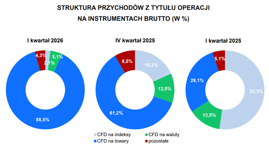W strukturze przychodów dominowały instrumenty CFD oparte na towarach, których udział wzrósł skokowo do 88,5% przychodów brutto z instrumentów finansowych wobec 29,1% w I kwartale 2025 r. Decydujący wpływ miała wysoka dochodowość na złocie, srebrze, ropie naftowej i platynie.
