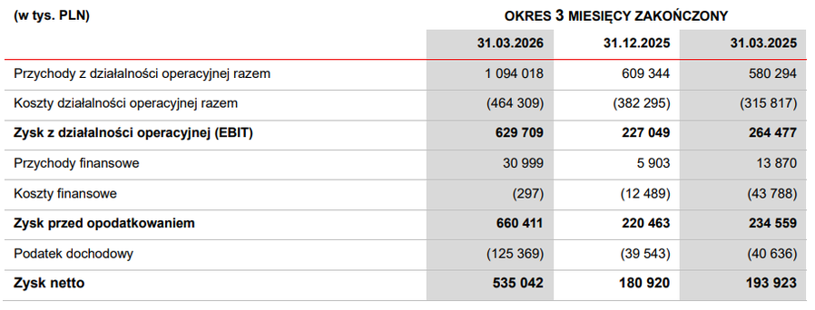 Grupa XTB opublikowała wstępne wyniki za I kwartał 2026 r., notując najwyższy w historii spółki skonsolidowany zysk netto na poziomie 535 mln zł (+175,9% r/r). Skonsolidowane przychody operacyjne osiągnęły w tym okresie również rekordowy poziom 1 094,0 mln zł, rosnąc o 88,5% r/r w porównaniu z 580,3 mln zł rok wcześniej.
